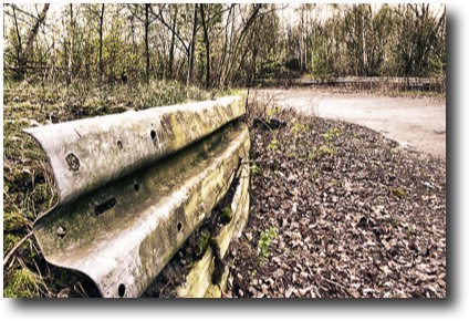 Von Nordosten her gehe ich die Rennstrecke ab und finde immer wieder Überreste und Zeitzeugen. Verwitterte Leitplanken, aus denen inzwischen Bäume wachsen. Mit Moos überwachsene Reifen. Leider auch Müll und entleerte Ölkanister. Die Fahrbahn kommt mir recht schmal vor, der Eindruck kann jedoch auch täuschen.
