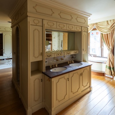 Das strohgedeckte Haus überrascht mit Räumen, die in ihrer Größe fast einschüchtern. Holzvertäfelungen treffen auf Marmor, in jedem Zimmer steht ein stattlicher Kamin, Zeuge vergangener Winterabende und üppiger Banketts. Hier mussten früher Tische für festliche Tafeln gestanden haben – Gäste in Abendgarderobe, Gespräche und Gelächter hallten durch diese Hallen.