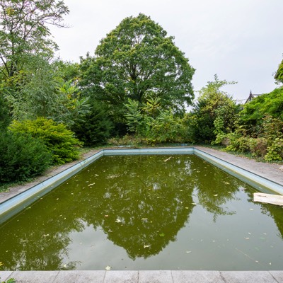 Ein Wintergarten mit Bar, ein Pool und eine prächtige Gartenanlage, deren Schönheit pittoresker kaum sein könnte, runden das Bild ab. Die Gärten wirken wie aus einem Katalog für Luxusanwesen – akkurat geschnittene Hecken, verspielte Wege und ein kleiner Teich, der das Sonnenlicht reflektiert.
